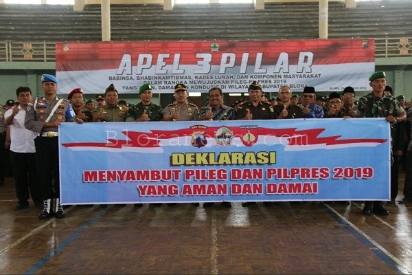 Blora – Sejumlah elemen pemerintahan, penyelenggara pemilu, partai politik dan tokoh masyarakat Kabupaten Blora mengikuti Apel Sinergitas Tiga Pilar. Kegiatan ini digelar sebagai penegasan untuk mewujudkan Pemilu 2019 yang aman, damai dan kondusif.