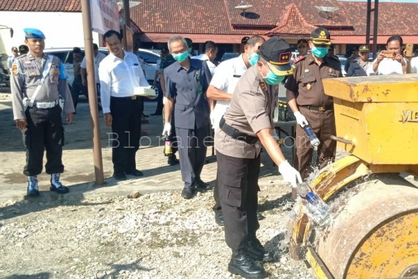 Blora- Ribuan botol miras berbagai jenis dimusnahkan aparat penegak hukum. Pemusnahan berlangsung halaman belakang Mapolres Blora dengan disaksikan jajaran Forkompimda, tokoh agama, dan tokoh masyarakat setempat.
