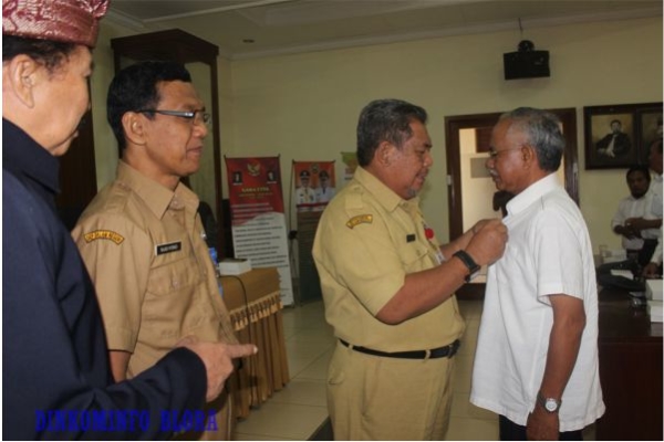 Asisten 1 Setda Blora, Setyo Edy menyematkan pin kepada Ketua FK Metra Kabupaten Blora, Mei Nariyono, Senin (23/07).