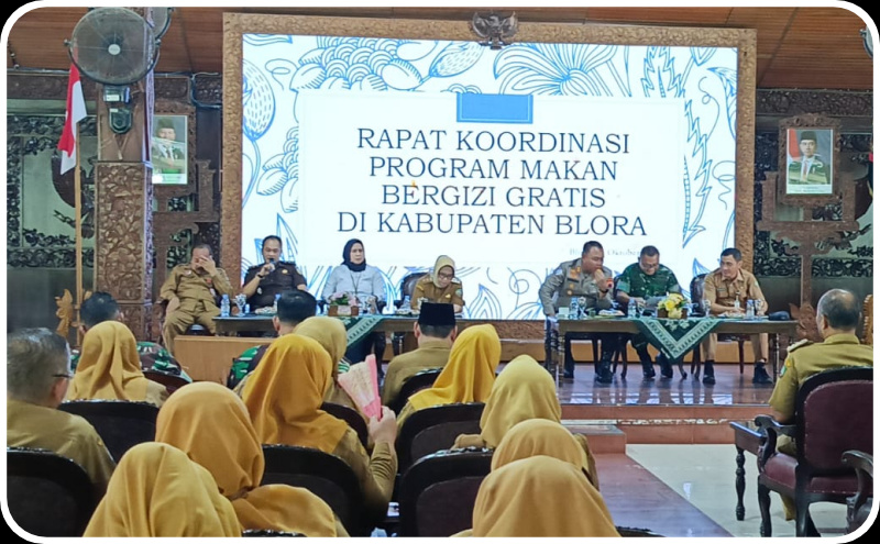 Suasana Rapat Koordinasi Program Makan Bergizi Gratis (MBG) di Pendopo Rumah Dinas Bupati Blora, diikuti jajaran Satgas, ahli gizi dapur SPPG, forkopimcam, dan perwakilan OPD terkait.