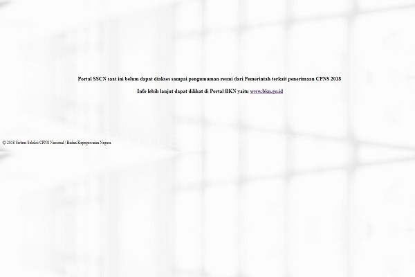 “Portal SSCN saat ini belum dapat diakses sampai pengumuman resmi dari Pemerintah terkait penerimaan CPNS 2018. Info lebih lanjut dapat dilihat di Portal BKN yaitu www.bkn.go.id,” demikain tertulis di portal sscn.go.id, Rabu (19/09) pukul 07.44 WIB.