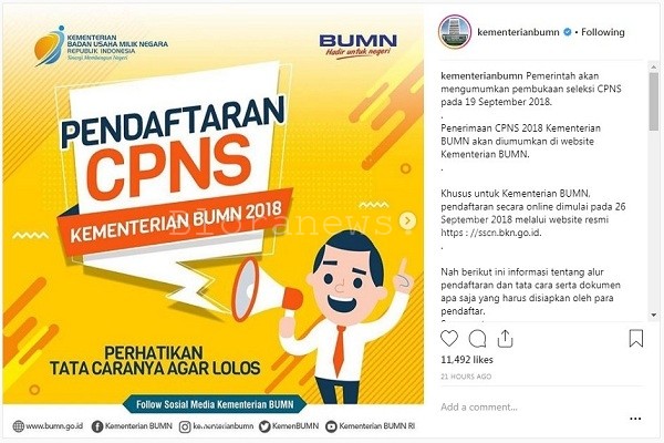 Sementara itu, Kementerian BUMN telah mengeluarkan pengumuman terkait pendaftaran CPNS 2018 untuk instansinya. Melalui akun resmi instagram Kementerian BUMN, @kementerianbumn, diumumkan pendaftaran CPNS di insstansi ini dibuka pada 26 September 2018.