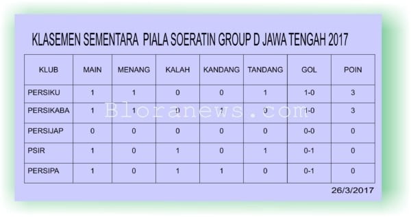 Blora – Persikaba Junior berhasil menaklukkan PSIR Rembang Junior dengan skor 1-0 di stadion Kridosono. Kemenangan ini, mengantarkan Persikaba Junior di peringkat 2 klasemen grup E di bawah Persiku Junior Kudus. Di hari yang sama, Persiku Kudus memenangkan pertandingan melawan Persipa Pati dalam laga tandang dengan skor 1-0. Selanjutnya, Persikaba Junior akan melawan Persipa Pati Junior tanggal 2 April depan.