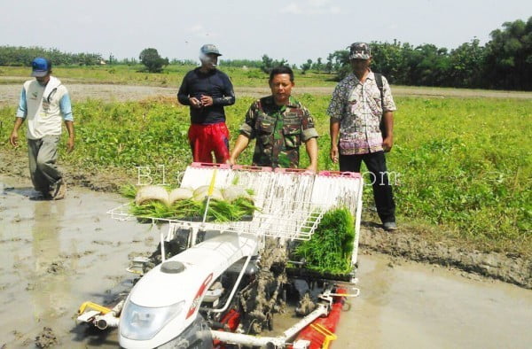 Untuk memudahkan petani dalam penanaman padi, Kepala UPT Pertanian Kedungtuban Suparman, Danramil Kedungtuban Kapten Inf Darmanto terjun ke sawah milik Poktan Tani Makmur 1 untuk mengenalkan alat tanam padi bernama Rice Transplanter, Kamis (07/12).