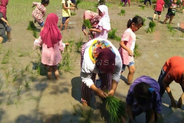 Cepu- Puluhan anak-anak SD Quwwatul Ummah Kedungtuban berkunjung ke Taman Baca dan Budaya Cethik Geni, di Dusun Wangkot Desa Kapuan Kecamatan Cepu, Blora. Di sini, anak-anak belajar menanam padi, memainkan gamelan dan mengenal bermacam makanan tradisional khas desa.