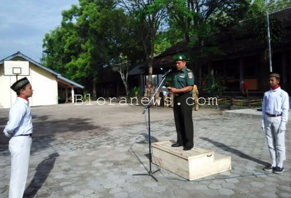 Bogorejo – Danpos Bogorejo Kodim 0721 Blora Peltu Rudy menyampaikan wawasan kebangsaan kepada ratusan pelajar di SMP Negeri 2 Bogorejo, Senin (05/11). Dalam kesempatan ini, Danpos Bogorejo menyampaikan materi tersebut dengan menjadi Inspektur Upacara di sekolah tersebut.