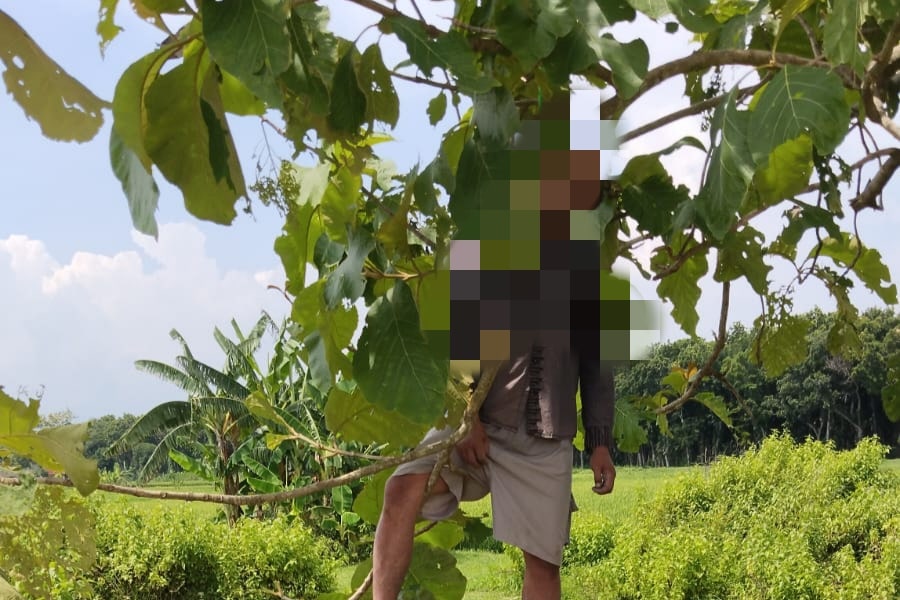 Lurah Wulung Abdul Haris saat dihubungi wartawan bloranews mengatakan, korban ditemukan sedang bergelantungan di sebuah pohon dengan posisi leher terikat tampar berwarna hijau.